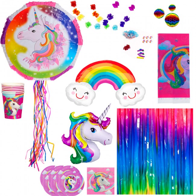 Набор для праздника в стиле "Единорог". Помимо одноразовой посуды на 6 персон в наборе есть тематический бумажный декор и пиньята с лентами.