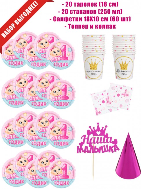 Набор бумажных тарелок «1 Годик», Малышка, 18 см (10 шт)
