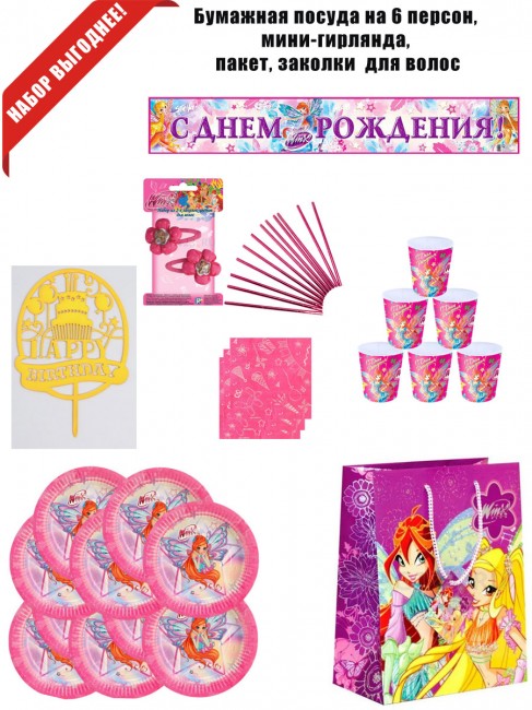 Набор бумажной посуды для праздника Винкс, на 6 персон