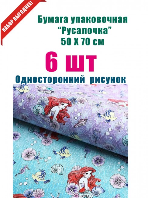 Бумага упаковочная Русалочка, 50 Х 70 см (1 шт) - (6шт)