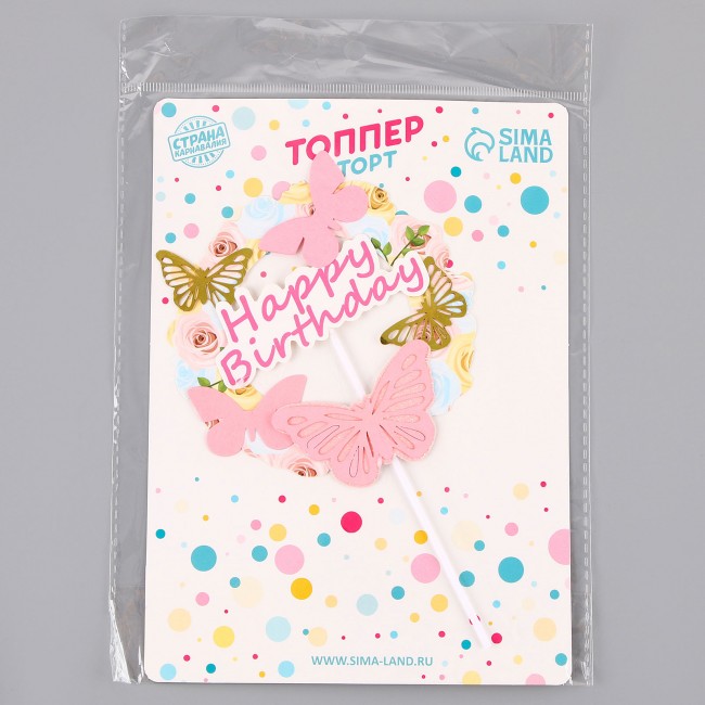 / Топпер для торта «С днём рождения» с бабочками, розовый